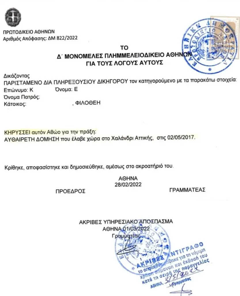 Υπόθεση αυθαίρετης δόμησης σε καταστημα υγειονομικού ενδιαφέροντος σε εστιατόριο στο Χαλάνδρι Αττικής. Το Δικαστήριο δέχθηκε τους υπερασπιστικούς ισχυρισμούς μας.