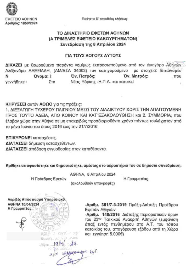 Υπόθεση Διεύθυνση και σύσταση εγκληματικής οργάνωσης με σκοπό την διεξαγωγή τυχερών παιγνίων μέσω διαδικτύου χωρίς άδεια απο την Εποπτική Αρχή σε μικρά καζίνο. Το Δικαστήριο δέχθηκε τους υπερασπιστικούς ισχυρισμούς μας.