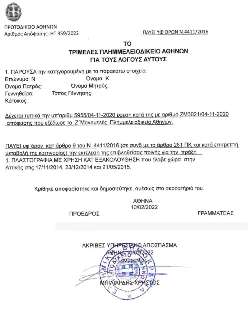 Το Δικαστήριο αποδέχθηκε την μετατροπή της κατηγορίας σε υπιότερη μορφή και για τον λόγο αυτό δέχθηκε την υφ’ όρων παύση της ποινικής δίωξης και άρα την αθώωση της εντολέος μας θέτοντας την δικογραφία στο αρχείο χωρίς ποινή με λευκό ποινικό μητρώο.