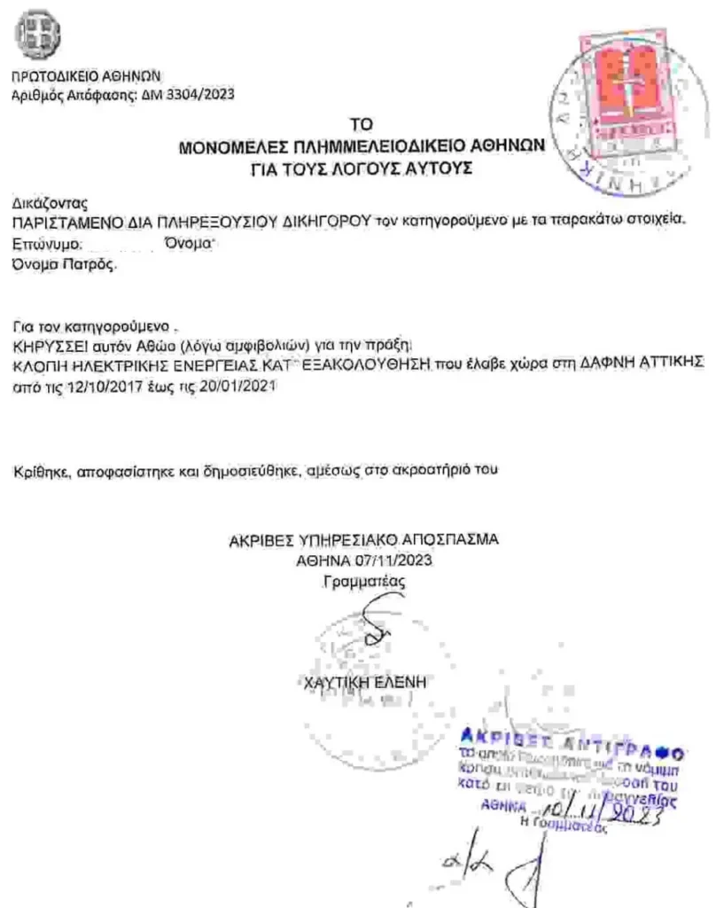 Το Δικαστήριο αποδέχθηκε ότι ο εντολέας μας παρόλο που ο μετρητής βρέθηκε παραβιασμένος και χωρίς σφραγίδες ότι τελικώς δεν είχε καμία πραγματική εμπλοκή απαλλάσοντας τον για το ποινικό αδίκημα της κλοπής ρεύματος – ρευματοκλοπής λόγω αμφιβολιών θέτοντας την δικογραφία στο αρχείο χωρίς ποινή με λευκό ποινικό μητρώο.